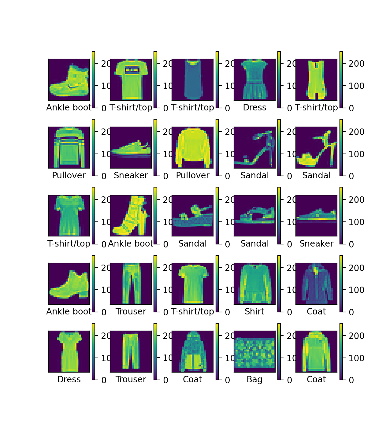 データセットとしては、Fashion MNISTを用います。Fashion MNISTはMNISTの代わりに利用する事が想定された衣料品の画像データセットです。MNIST(0〜9までの手書き数字の画像データ)は非常によく用いられていますが、単純すぎる事やあまりに頻繁に使われる事もあり、それを置き換えるものとしてFashion MNISTが提案されました。このデータは、T-shirt/top, Trouser, Pullover, Dress, Coat, Sandal, Shirt, Sneaker, Bag, Ankle bootの10分類からなり、TensorFlow等の機械学習ライブラリから呼び出す事が可能です。一部をmatplotlibを使って表示すると下のようになっています。