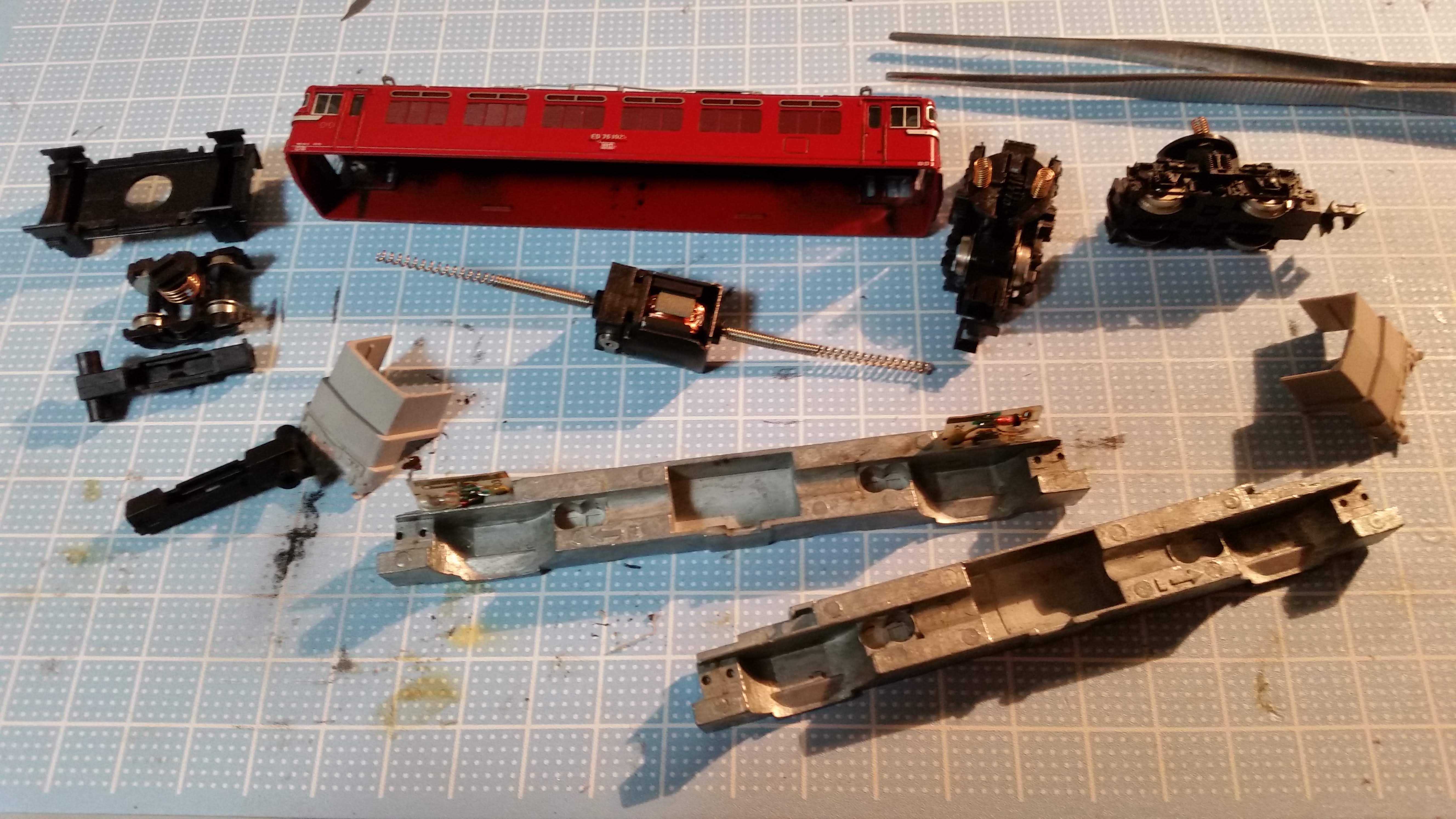 - 何年も保管放置したままの動力車は直ちに動かないこともあるが、部品そのものは損傷していないことが多く、分解メンテナンスで清掃や注油を行うことで復活する。前述の機関車もそうだが、購入から30年以上経過した動力車はメンテナンスによりほぼ全面的に復旧した。